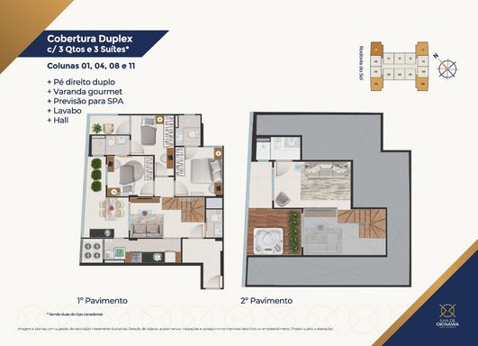 Apartamento Duplex: Sala, varanda, cozinha, 3 quartos sendo uma suíte tradicional e duas canadenses, um banheiro social, área de serviço e 2 vagas de garagem para carro e 1 para moto.